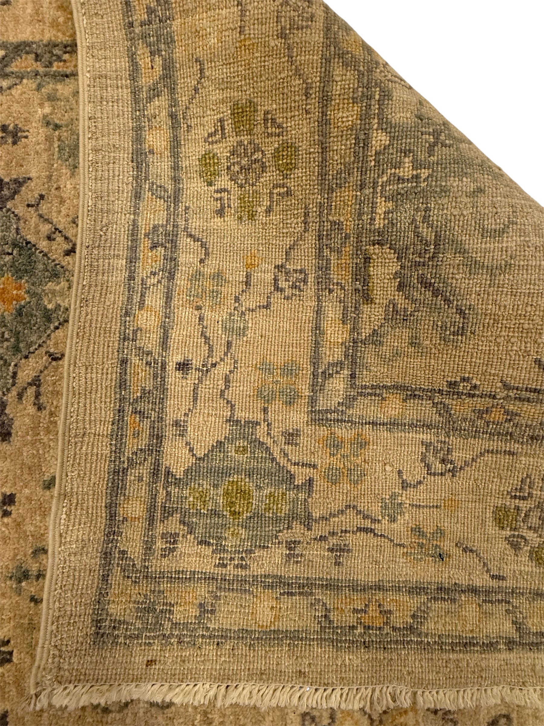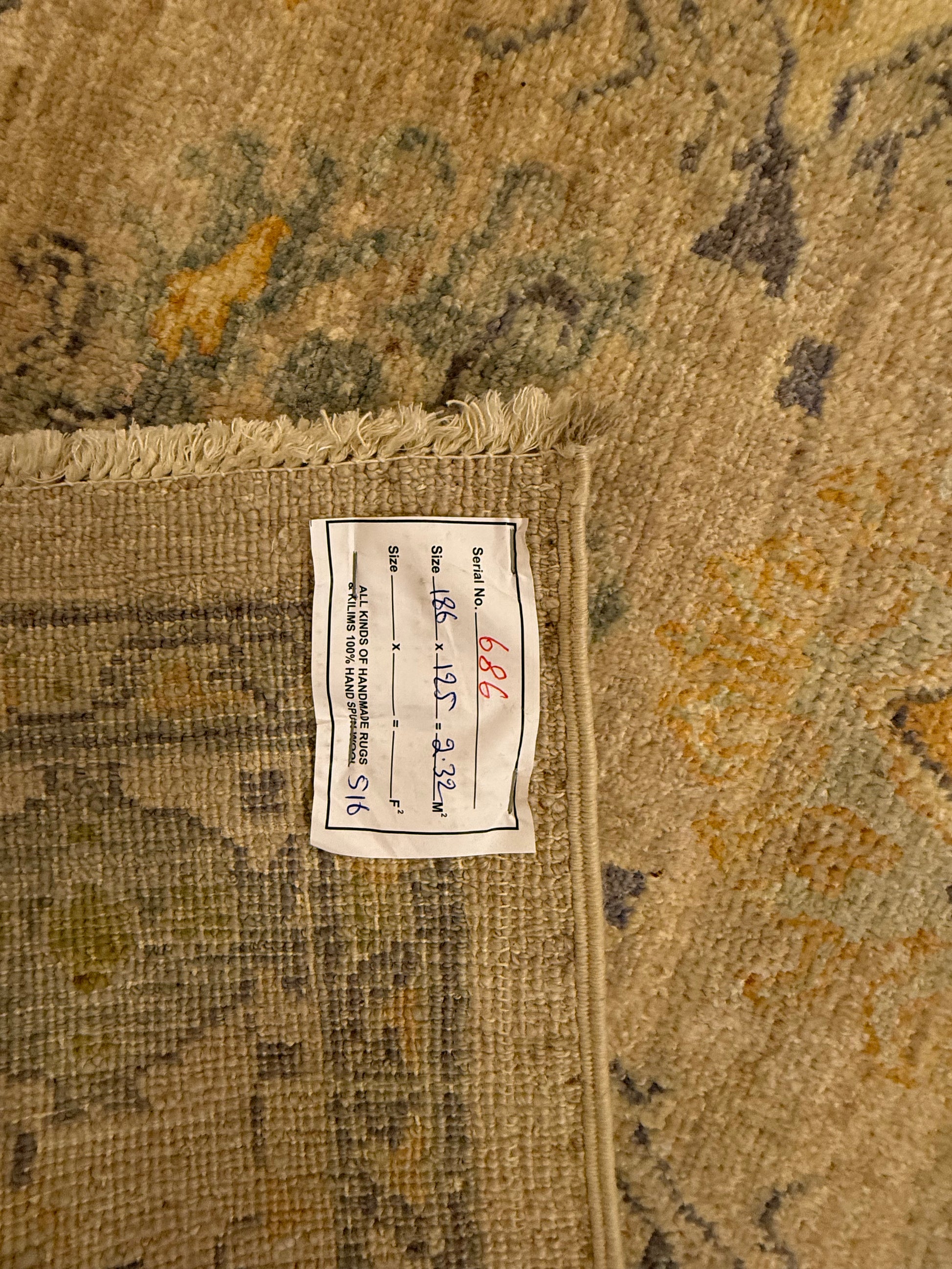 Materiaal: Wol, schering en inslag van katoen. Het tapijt heeft prachtig afgewerkte uiteinden met kleurrijke franjes.