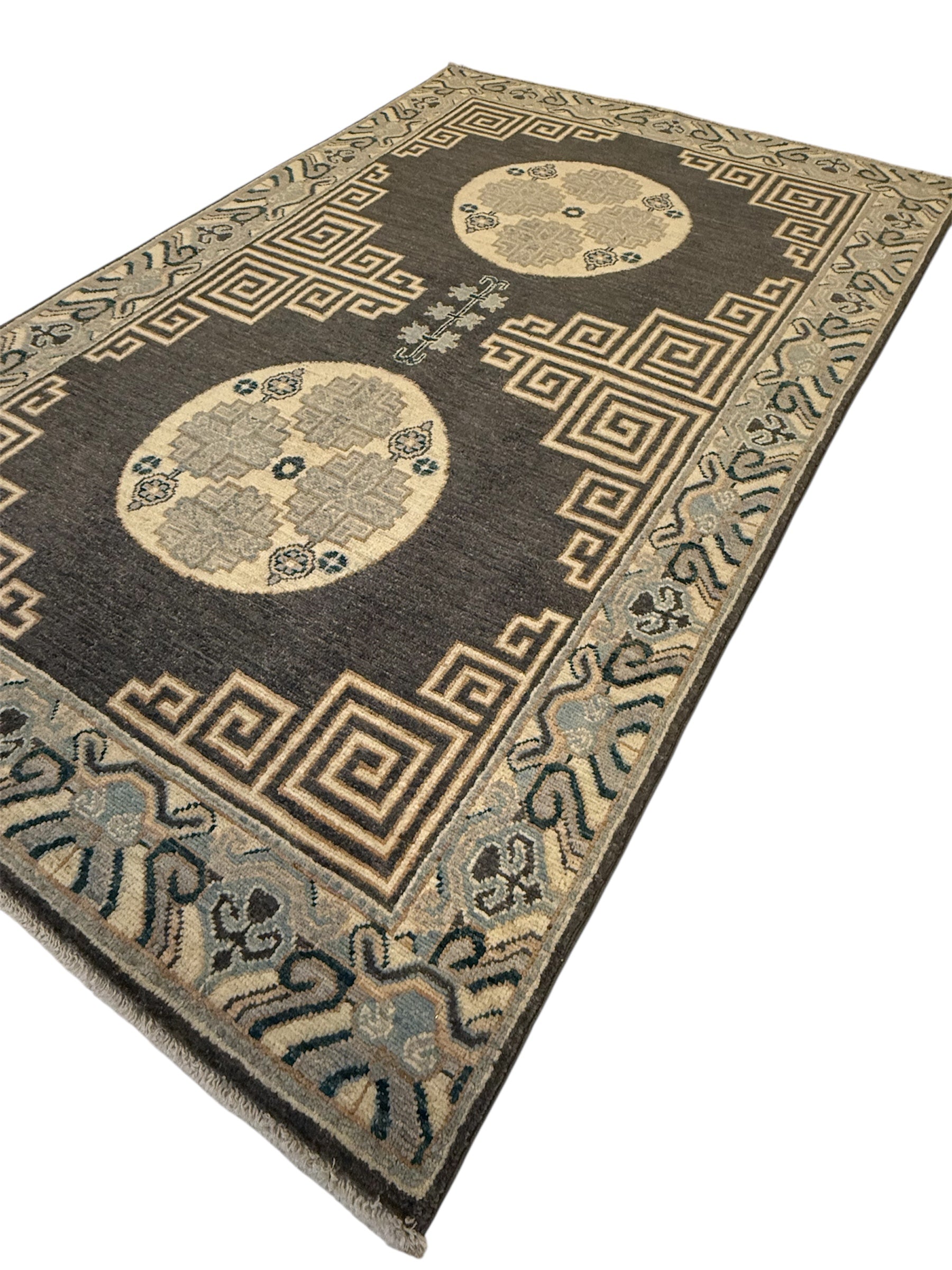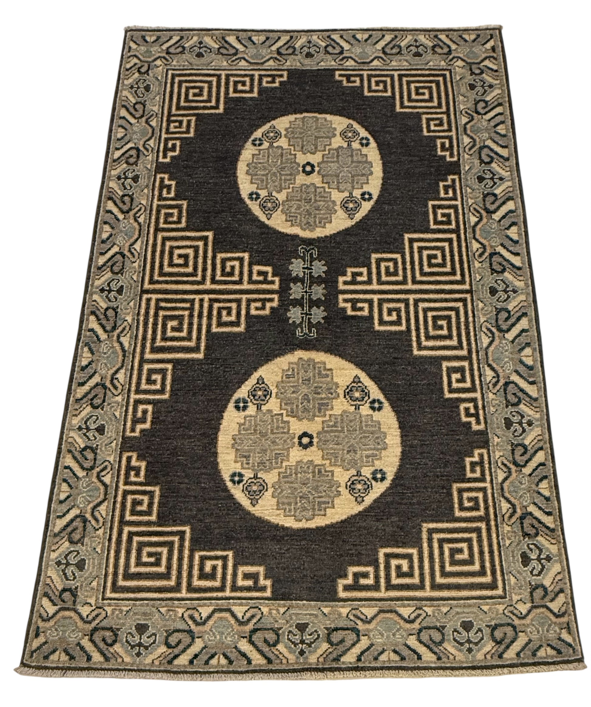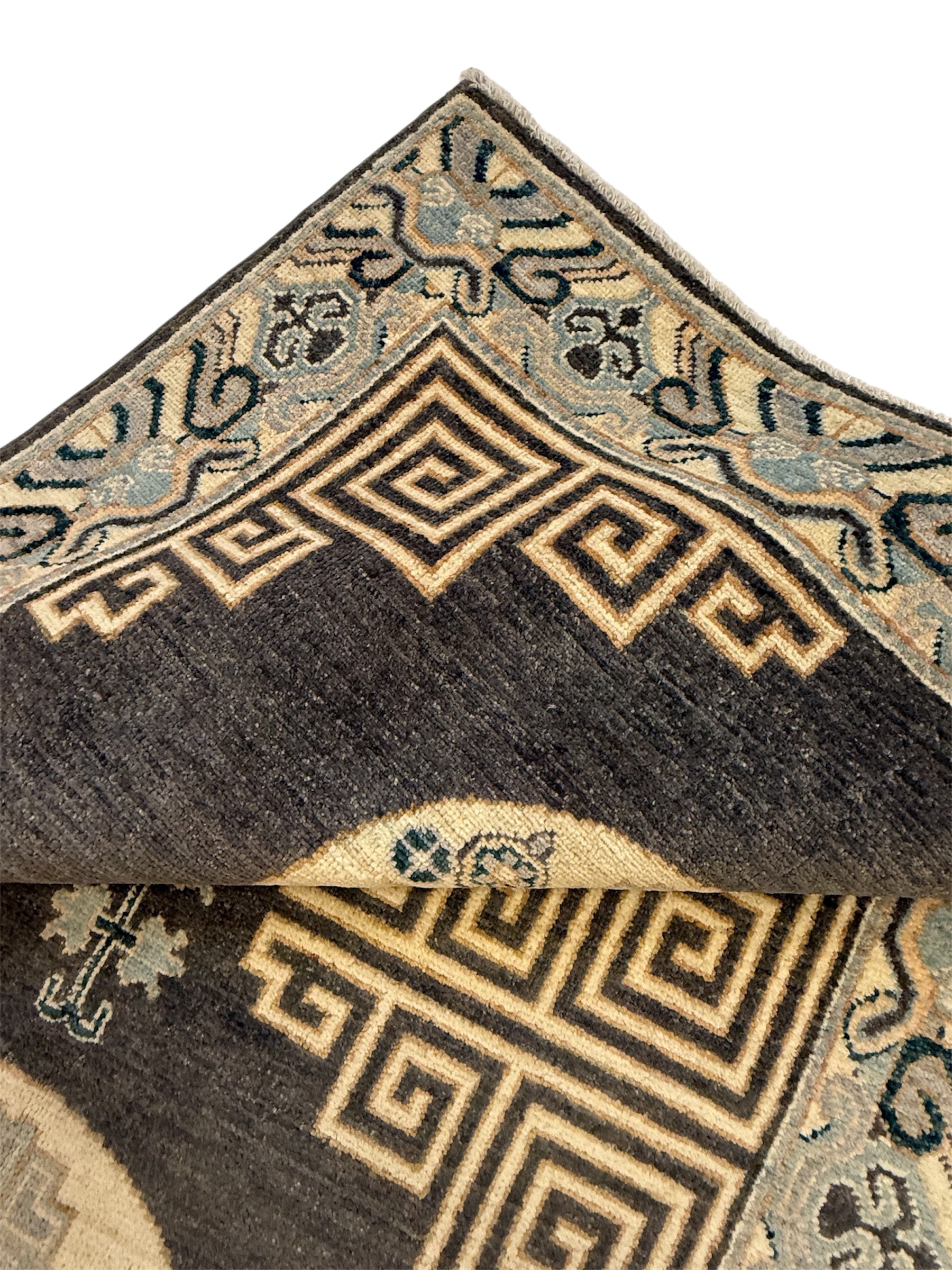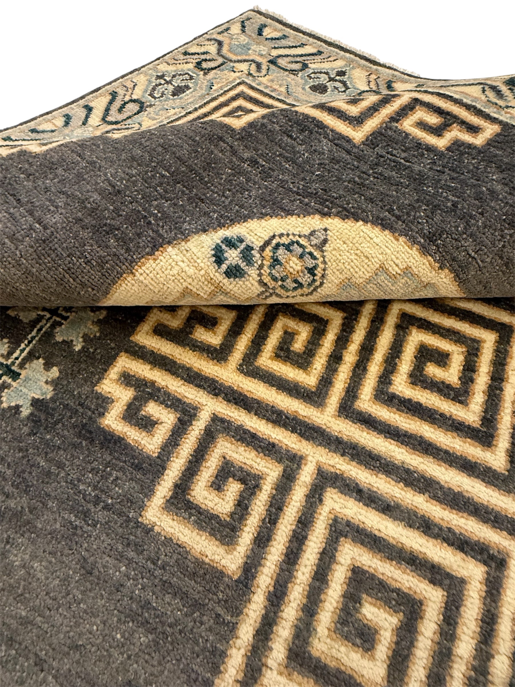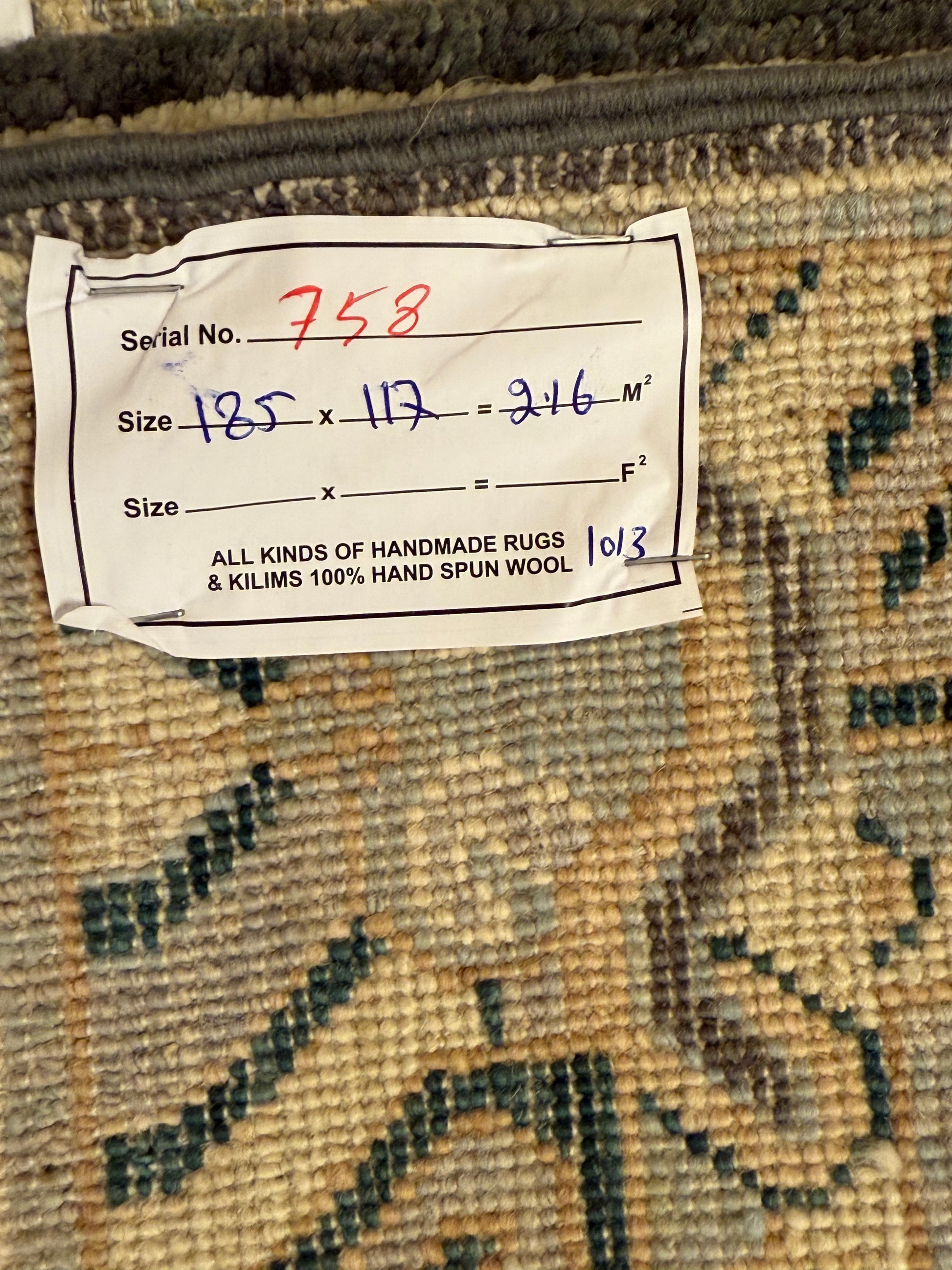 Materiaal: Wol, schering en inslag van katoen. Het tapijt heeft prachtig afgewerkte uiteinden met kleurrijke franjes.
