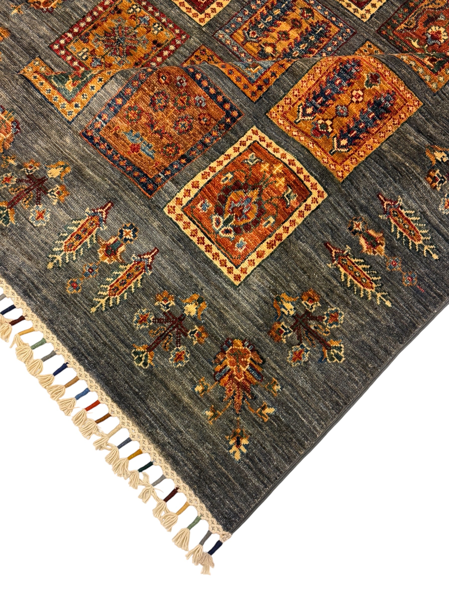 Dit is een moderne Afghaanse interpretatie van dit klassieke patroon. Elk paneel vertegenwoordigt een tuin. Deze tuinen zijn geplaatst tegen een groene achtergrond. Deze overzichtelijke versie is een zeer geslaagde bewerking van een oud Oosters/Perzisch patroon. De aantrekkelijke kleuren met een open ruimte rond elke "tuin" zorgen voor een meer eigentijdse uitstraling.