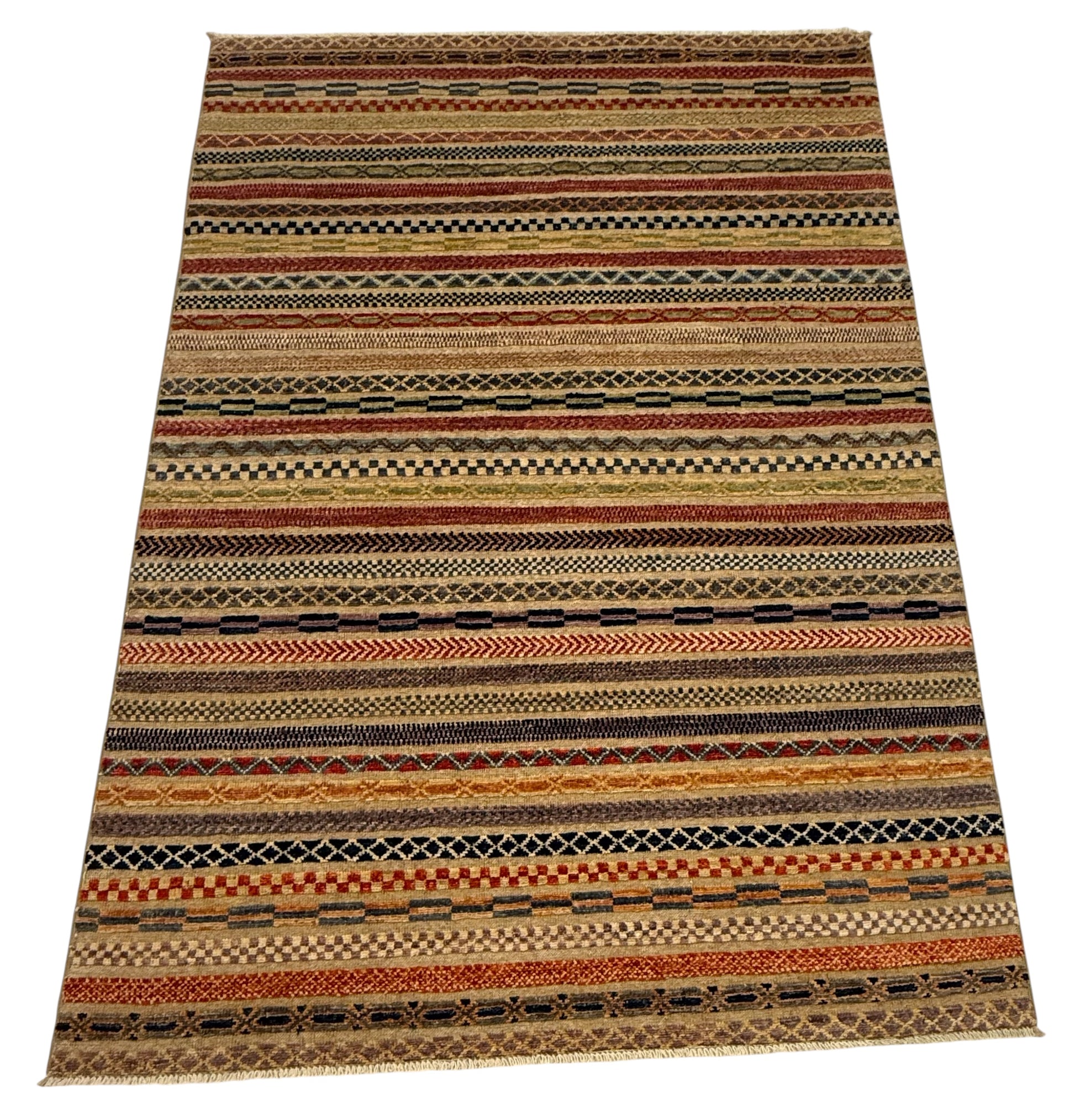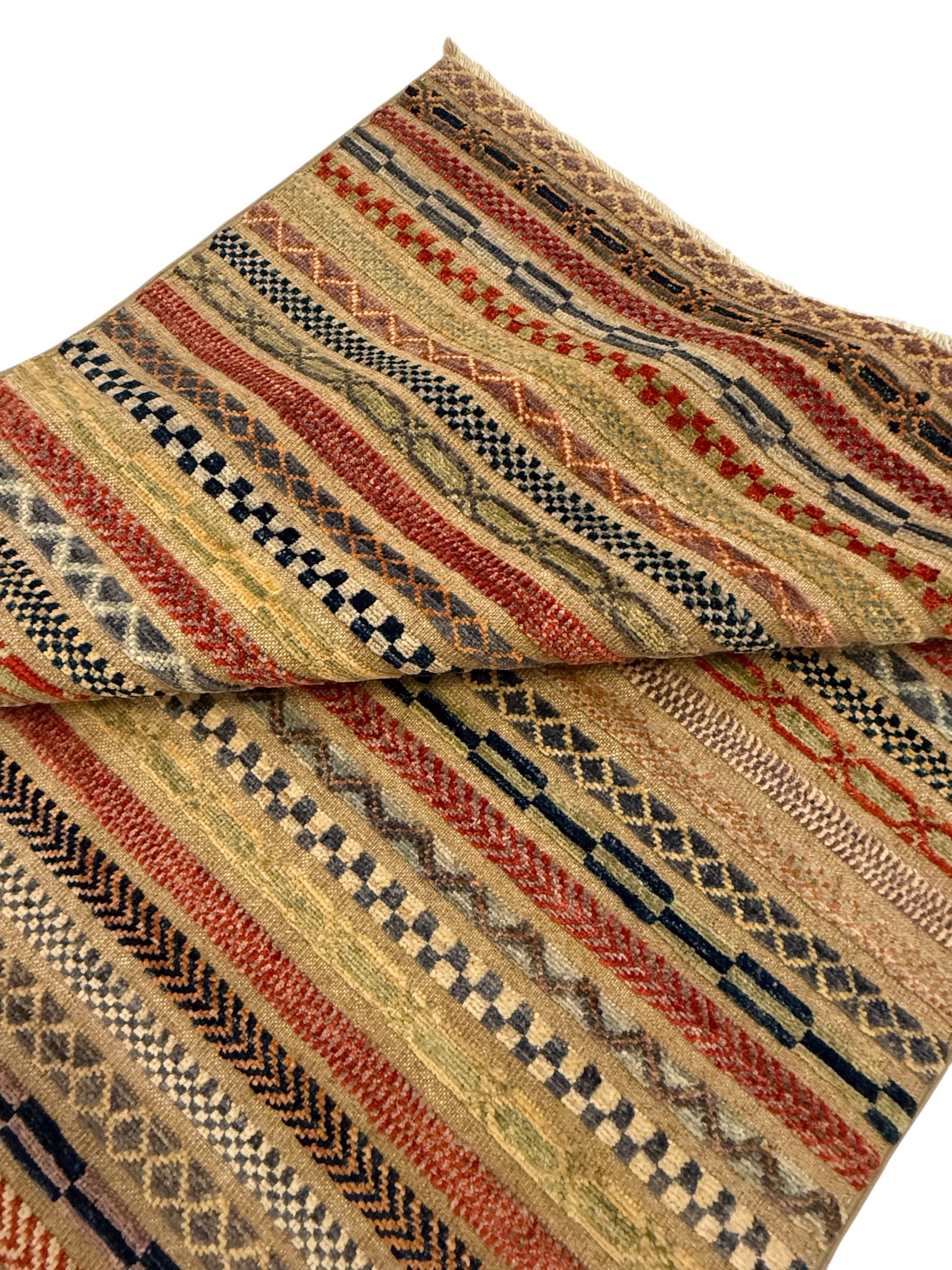 Afghaanse Gabbeh Loribaft tapijt gemaakt van handgesponnen wol en plantaardige verfstoffen.