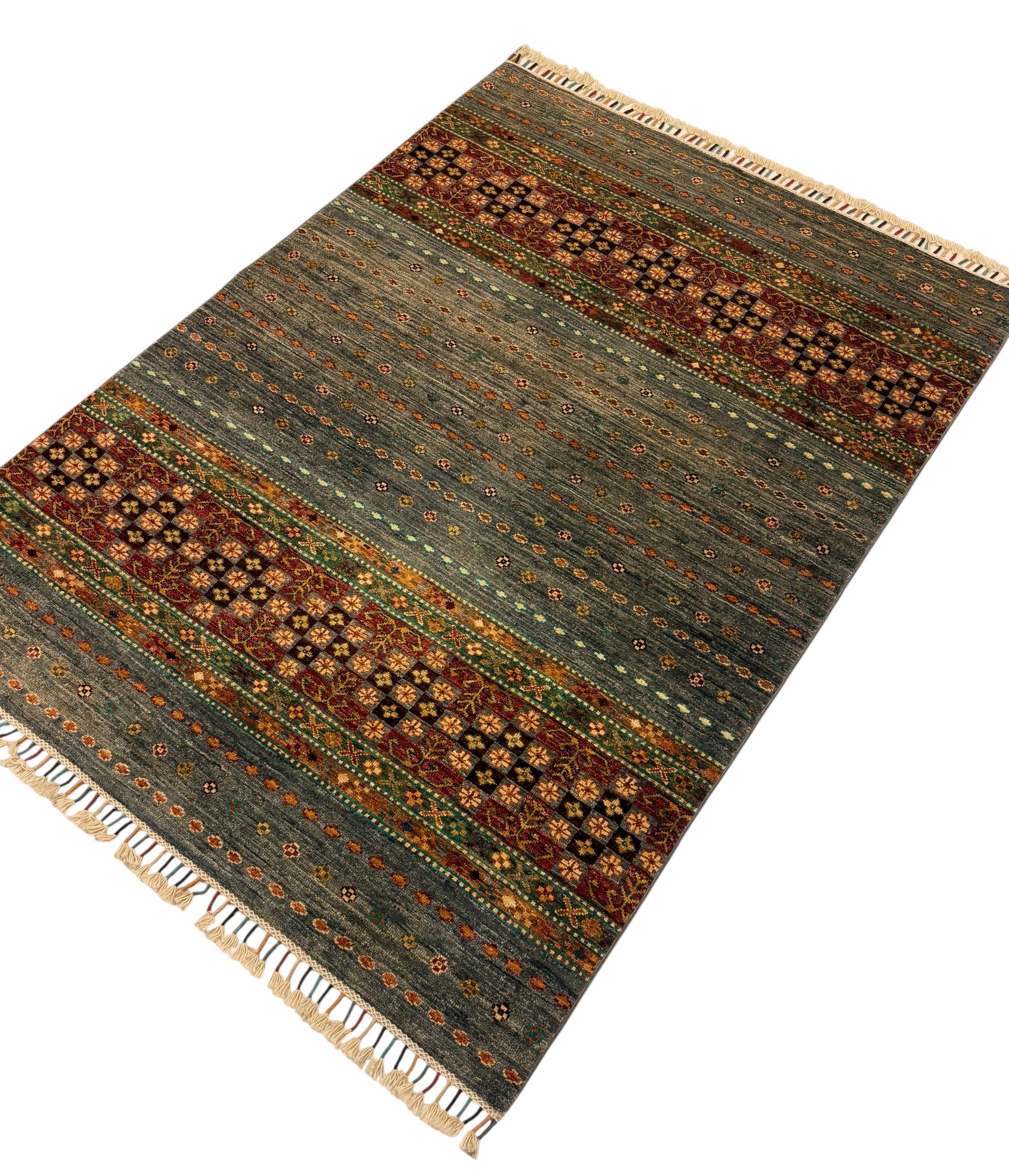 Dit is een moderne Afghaanse interpretatie van dit klassieke patroon. Elk paneel vertegenwoordigt een tuin. Deze tuinen zijn geplaatst tegen een groene achtergrond. Deze overzichtelijke versie is een zeer geslaagde bewerking van een oud Oosters/Perzisch patroon. De aantrekkelijke kleuren met een open ruimte rond elke "tuin" zorgen voor een meer eigentijdse uitstraling.