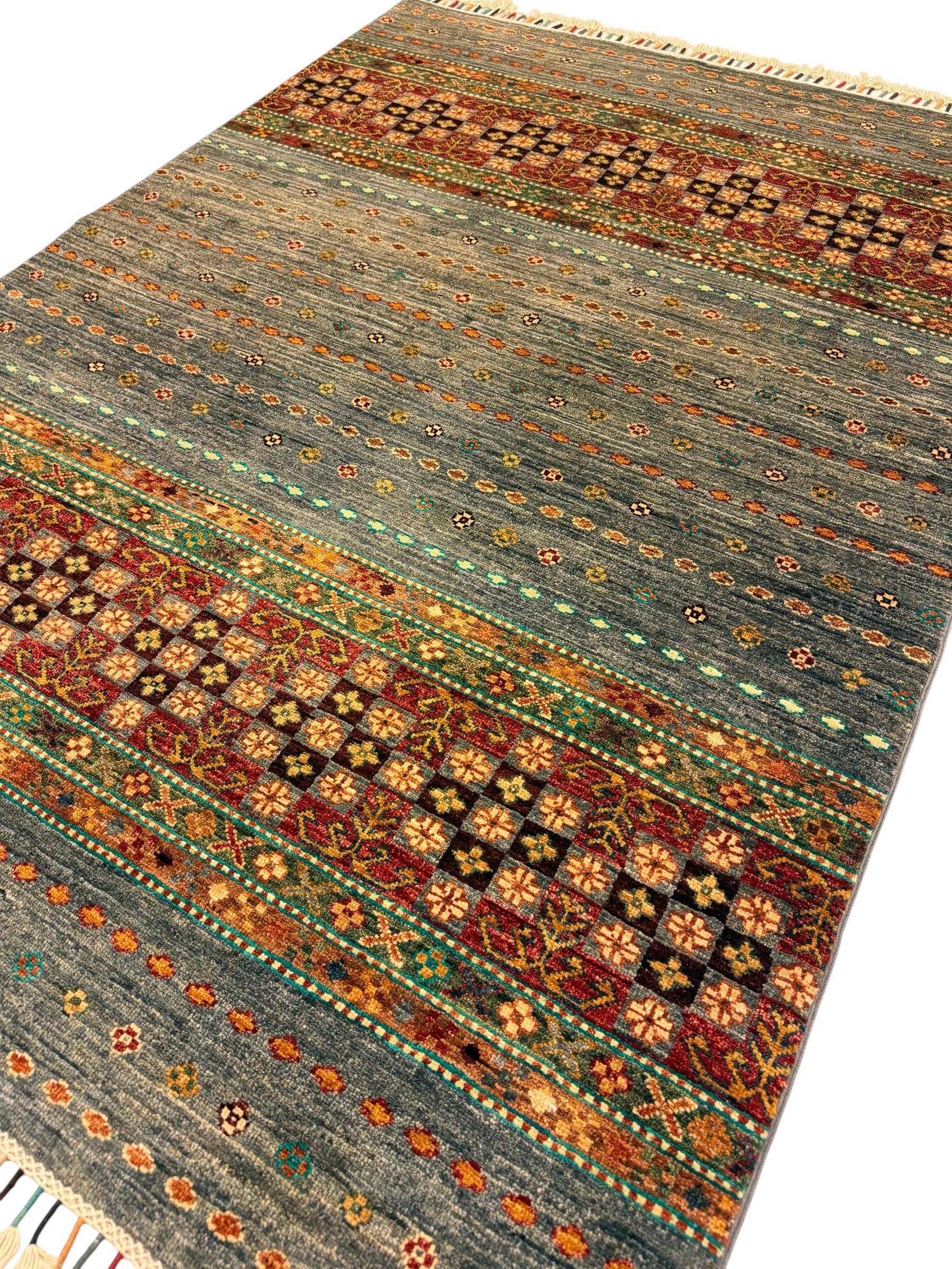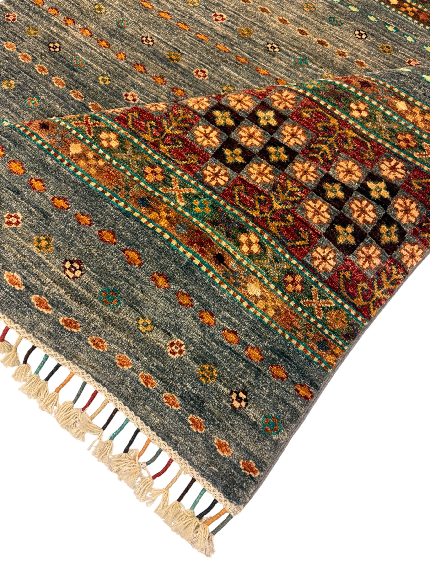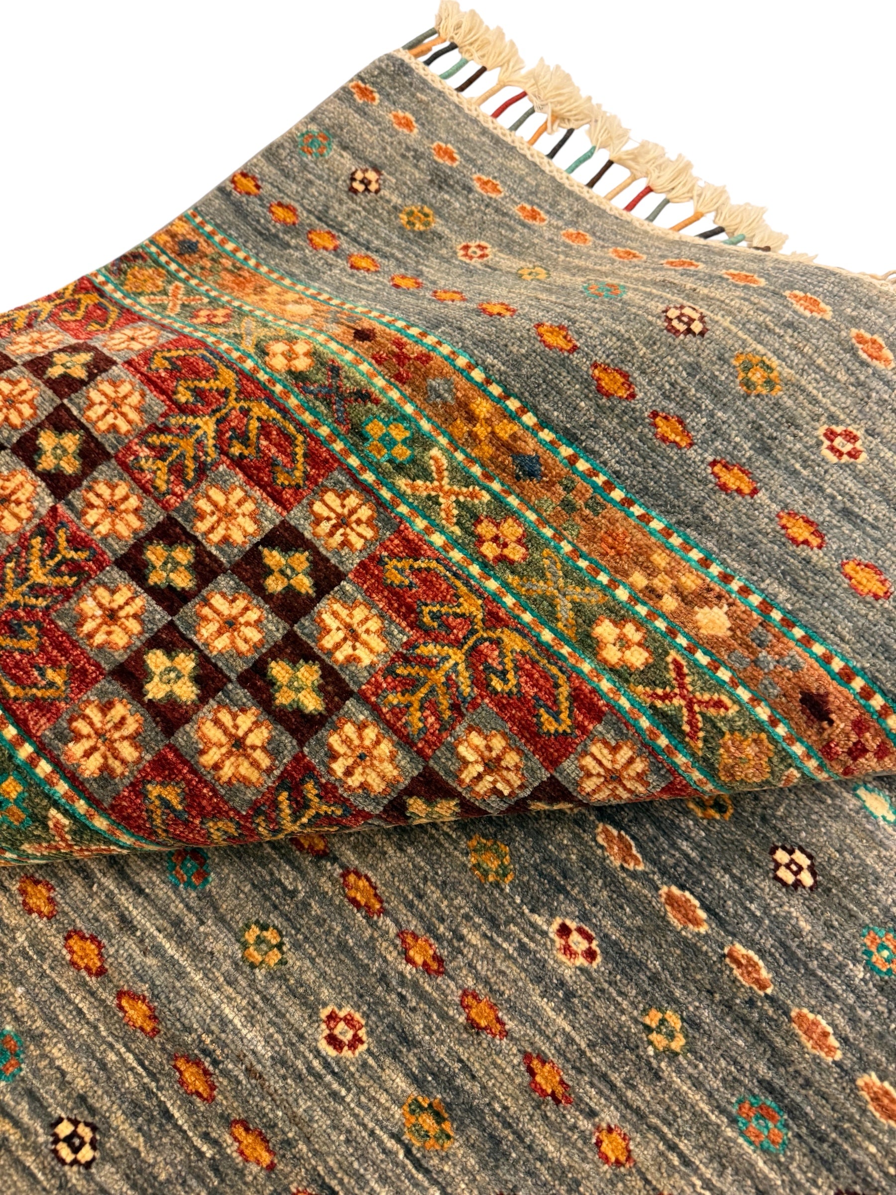 Materiaal: Wol, schering en inslag van katoen. Het tapijt heeft prachtig afgewerkte uiteinden met kleurrijke franjes.