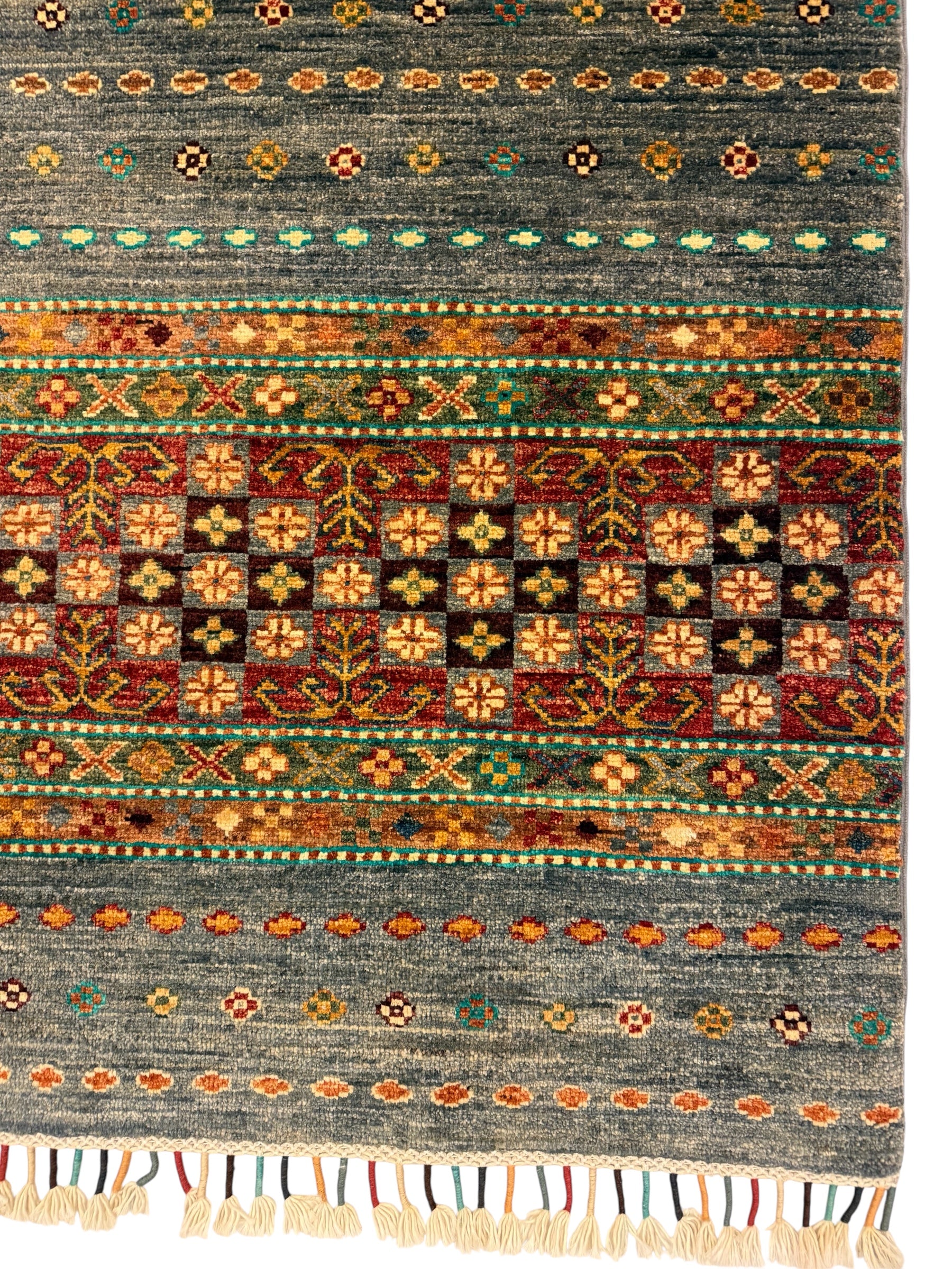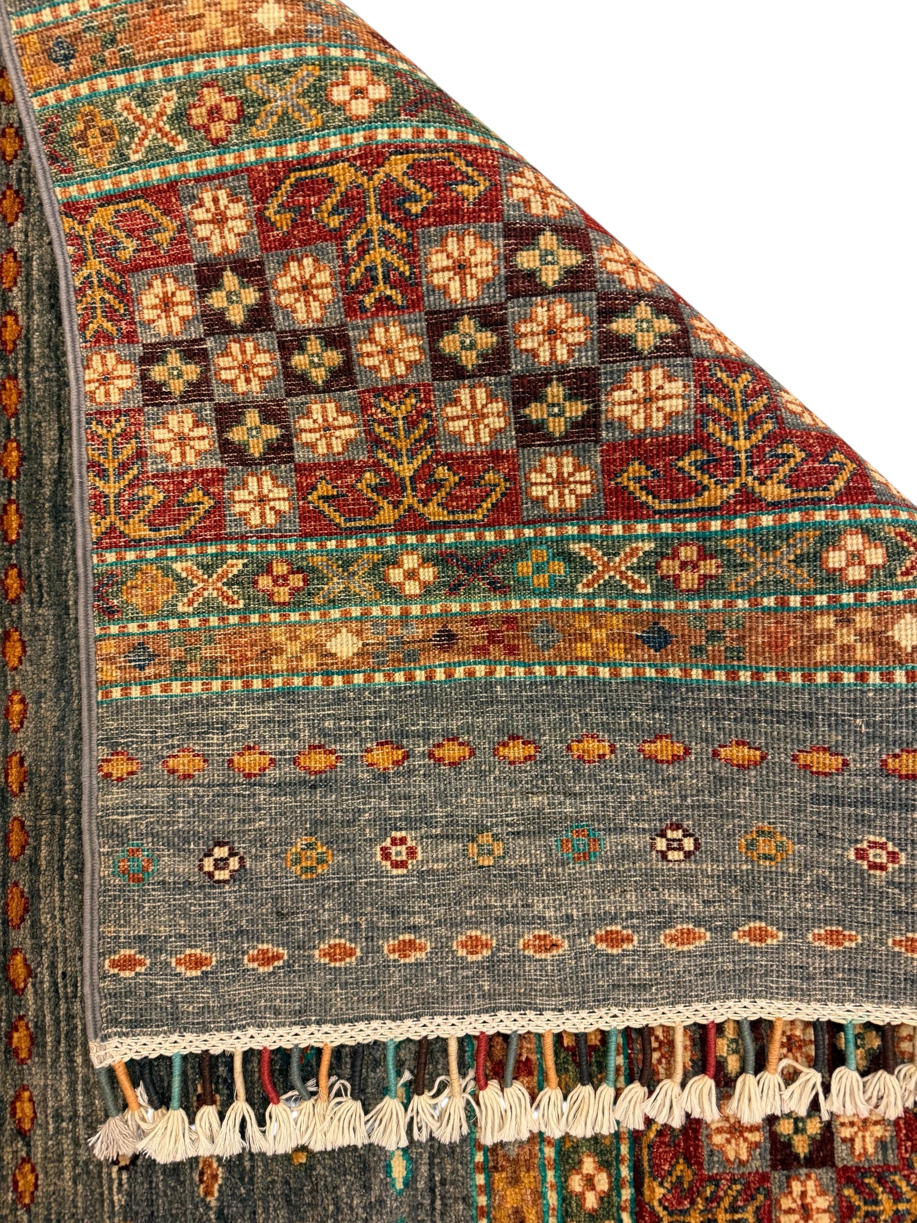 Dit is een stijlvolle, handgemaakte Afghaanse bewerking van het iconische "Tuin"-ontwerp. Dit patroon werd beroemd door de Khurjin-stam in Iran. De Afghaanse wevers hebben het tuinpatroon op ingenieuze en succesvolle wijze gemoderniseerd door het te vereenvoudigen.