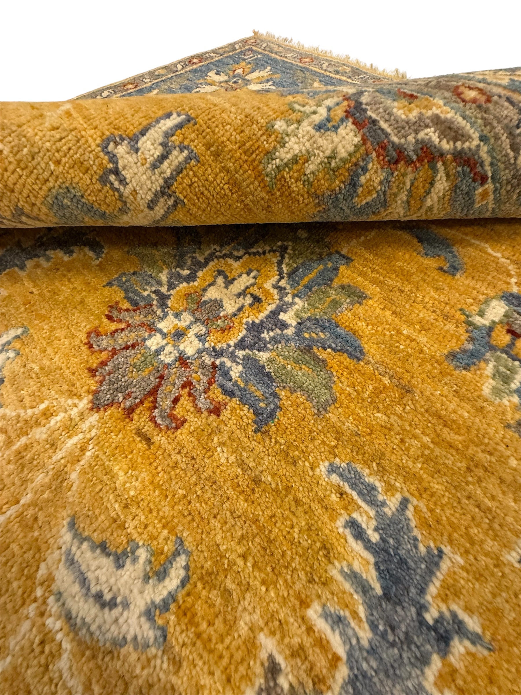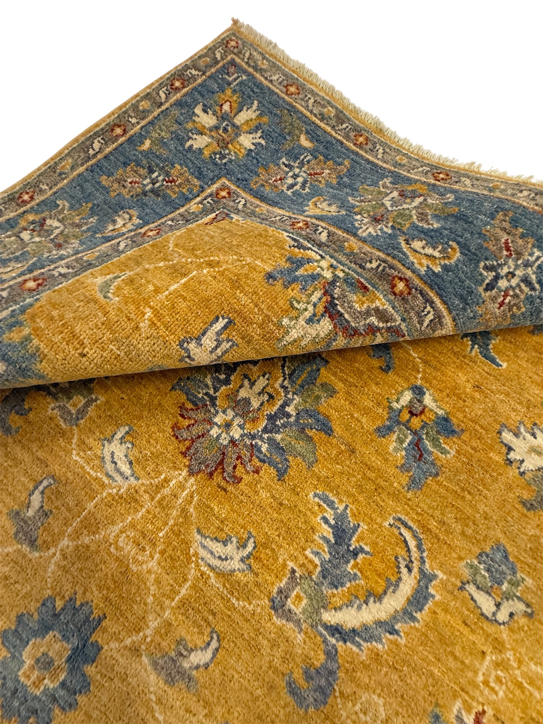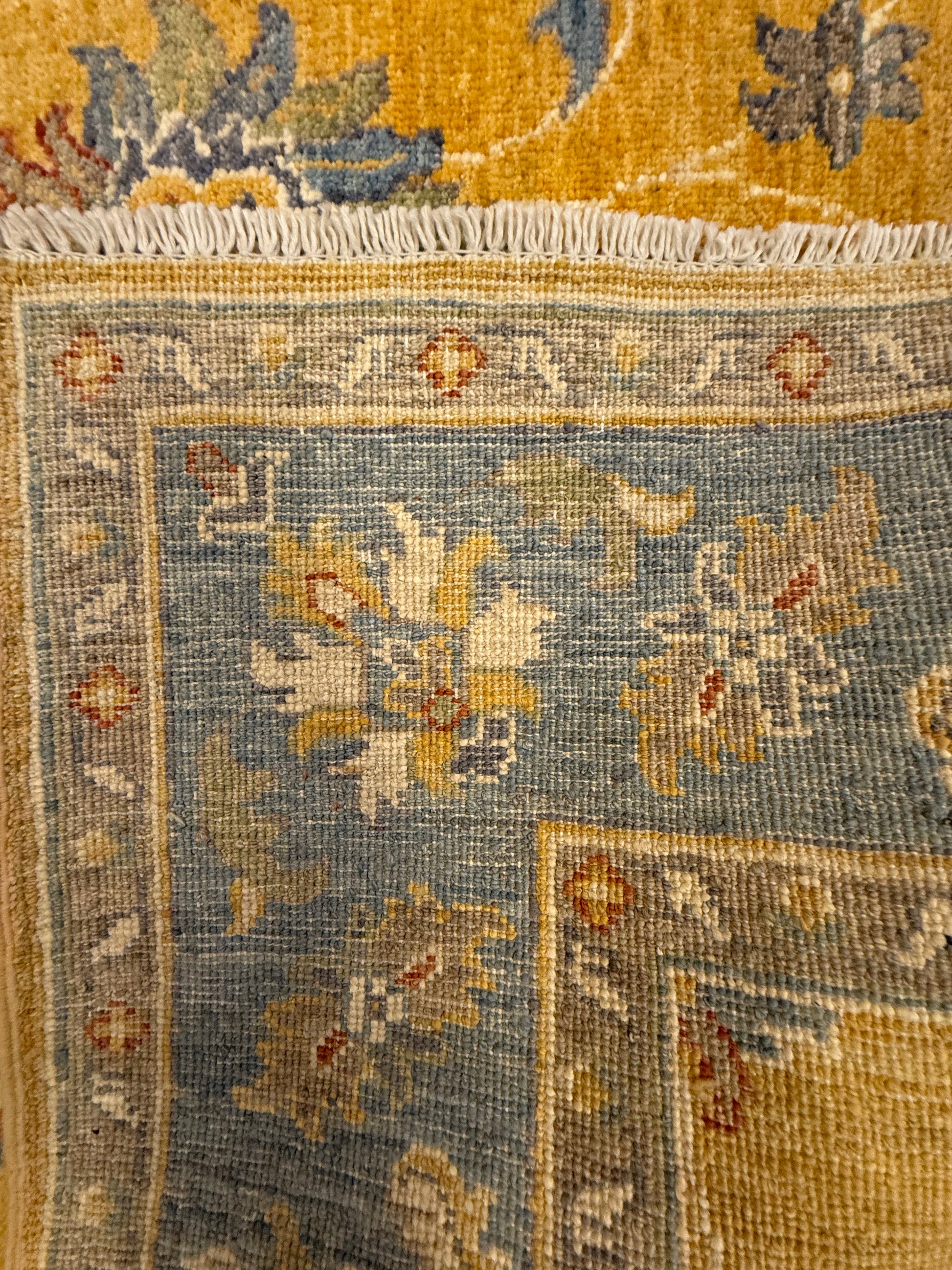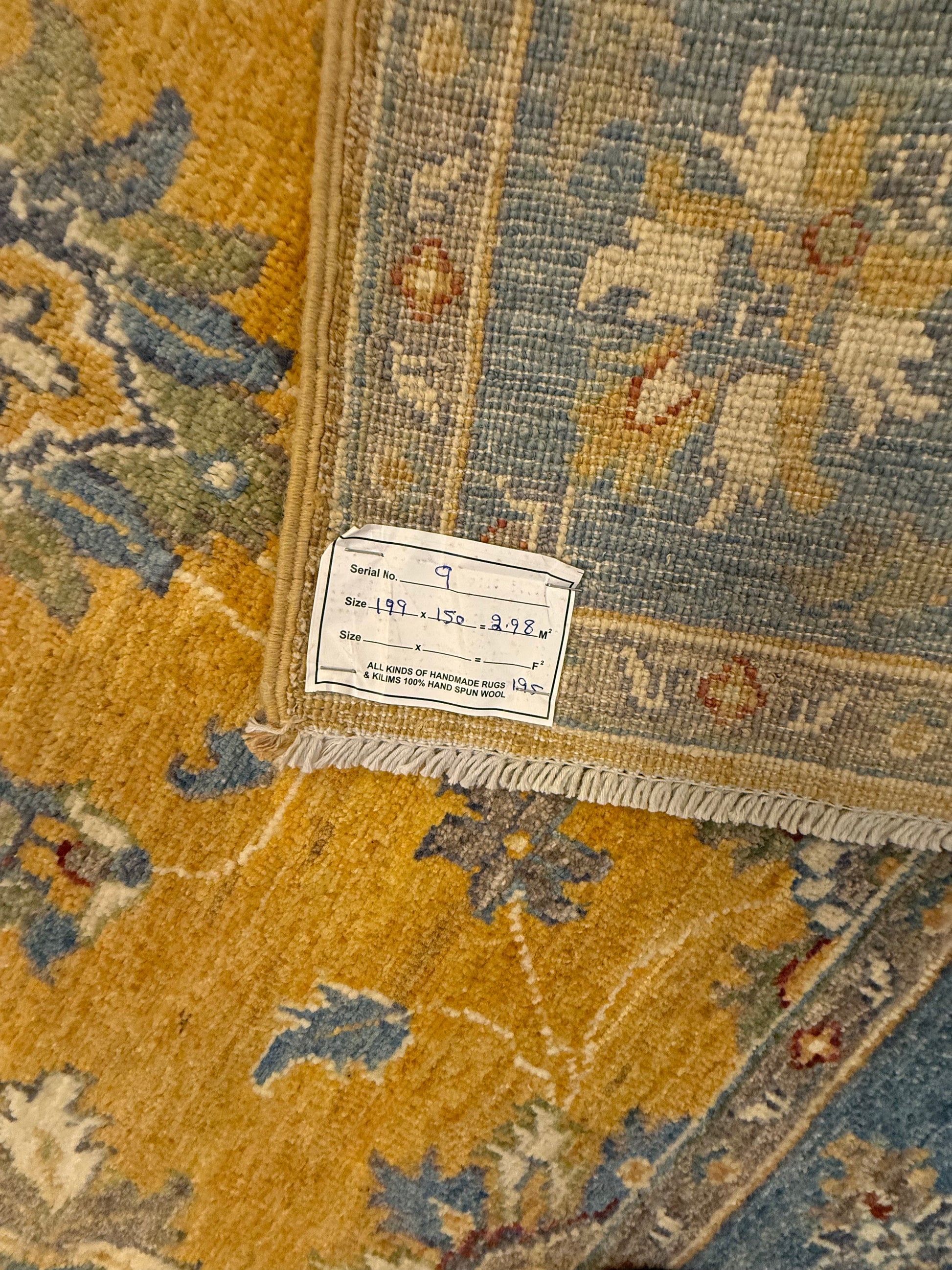 Materiaal: Wol, schering en inslag van katoen. Het tapijt heeft prachtig afgewerkte uiteinden met kleurrijke franjes.