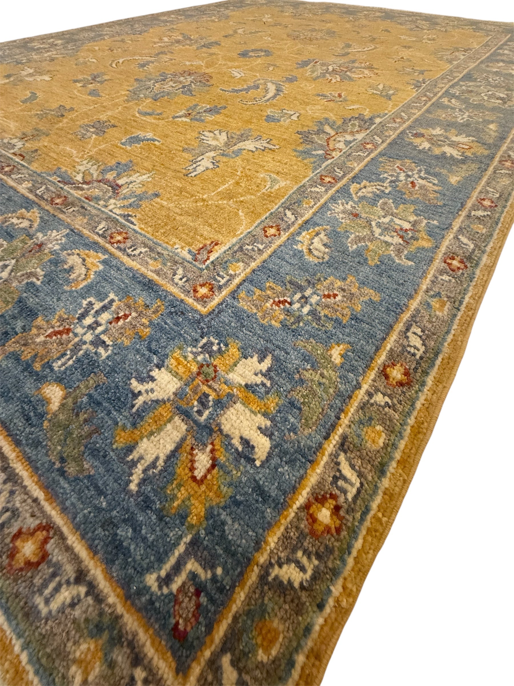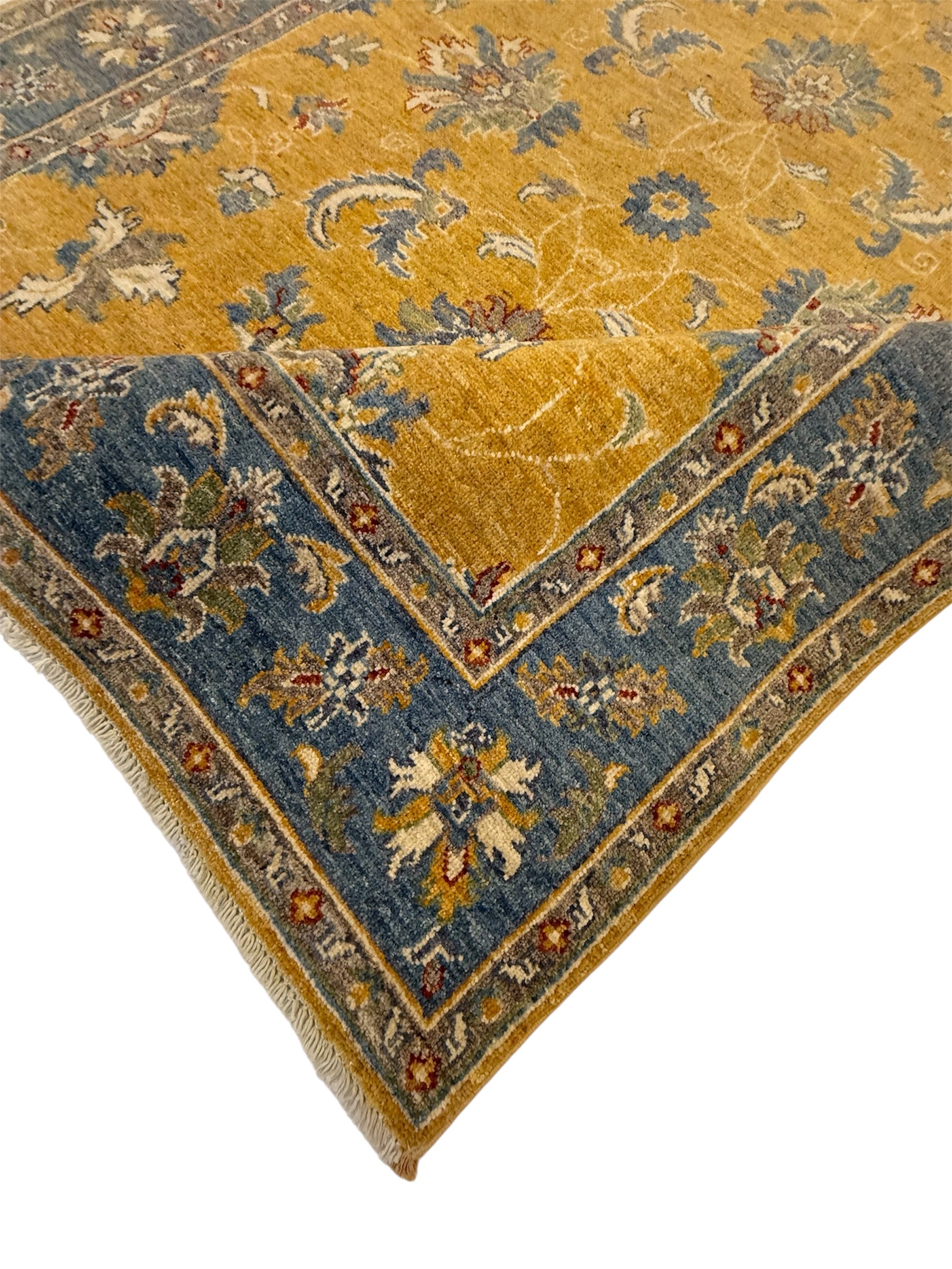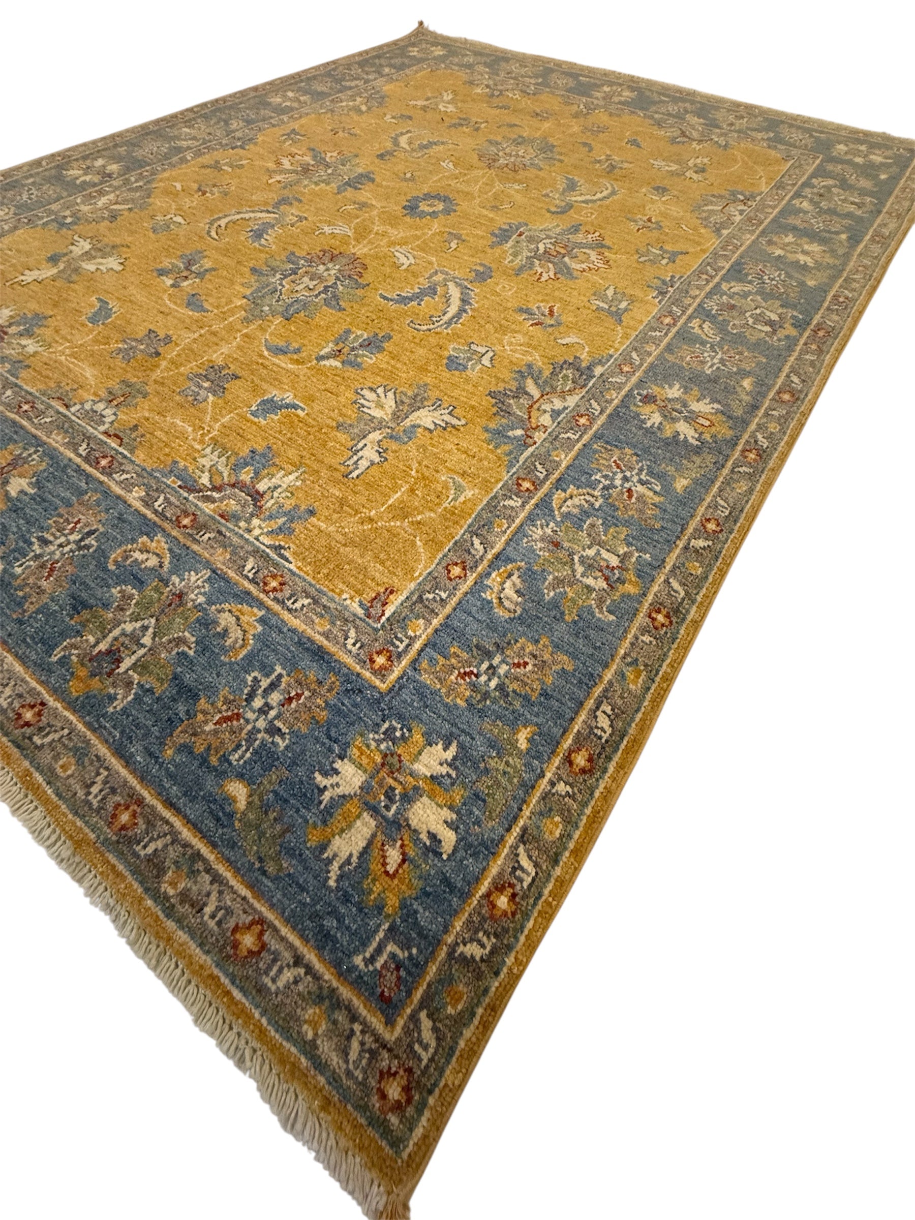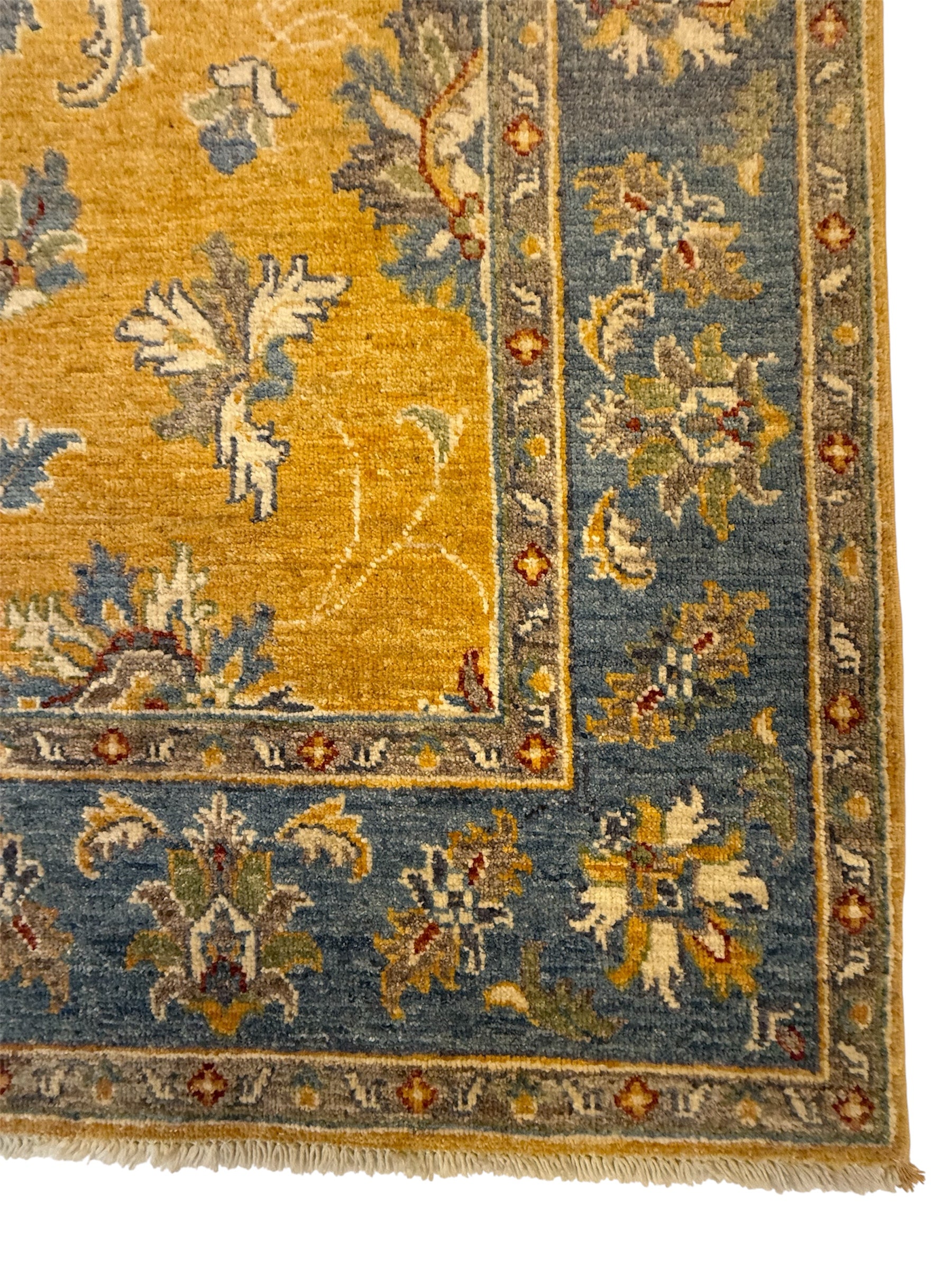 Materiaal: Wol, schering en inslag van katoen. Het tapijt heeft prachtig afgewerkte uiteinden met kleurrijke franjes.