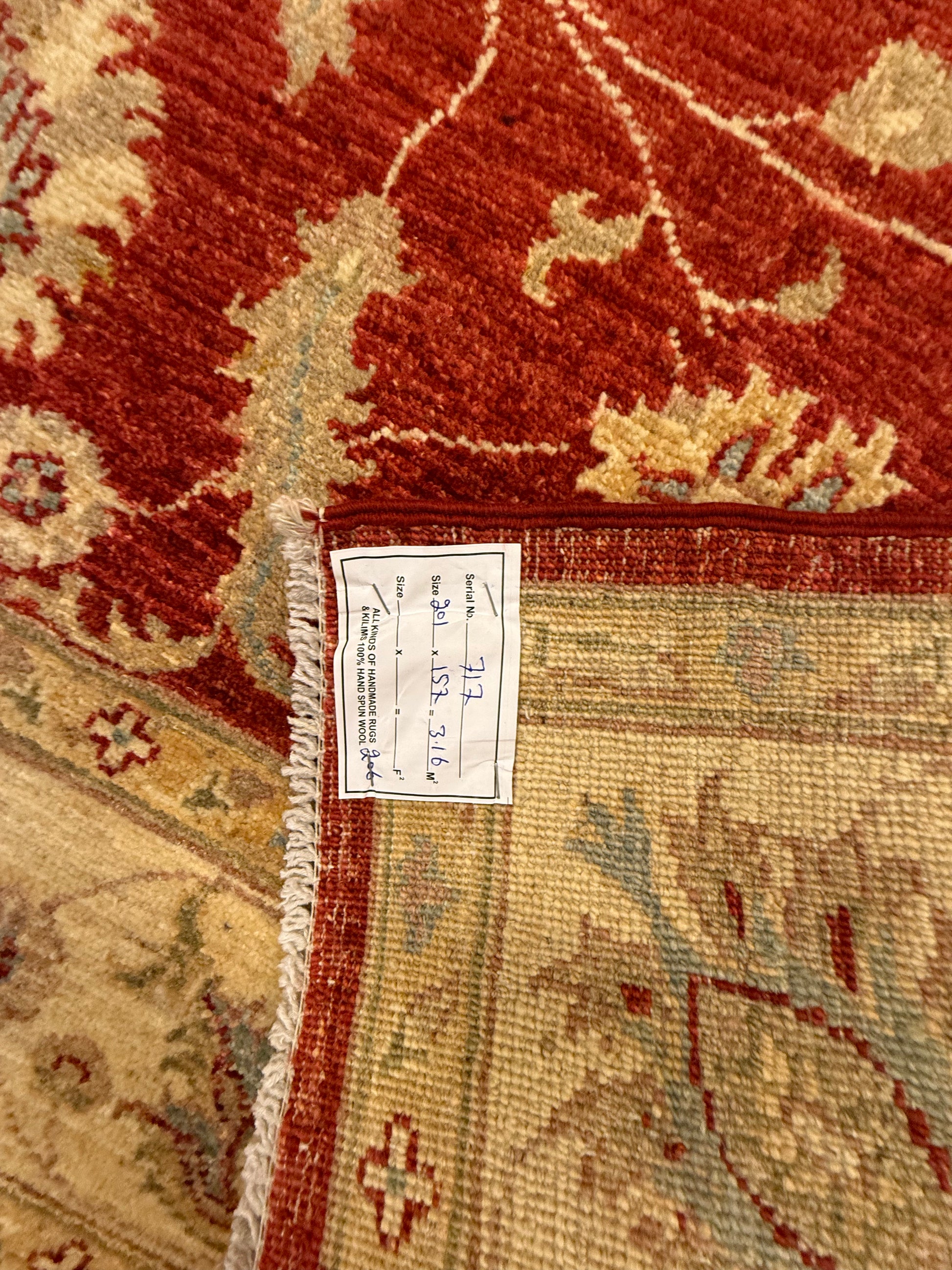 Materiaal: Wol, schering en inslag van katoen. Het tapijt heeft prachtig afgewerkte uiteinden met kleurrijke franjes.